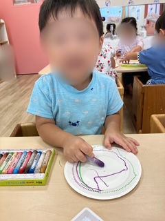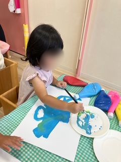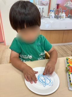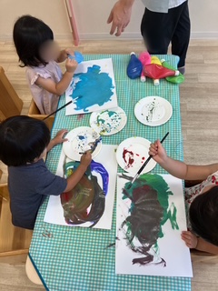 絵の具の感触を楽しんでいたり、色と色が混ざるところを見てワクワクしながらお絵描きに熱中する子どもたちでした♪