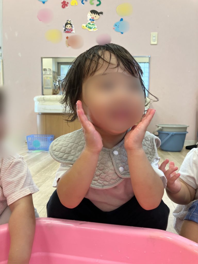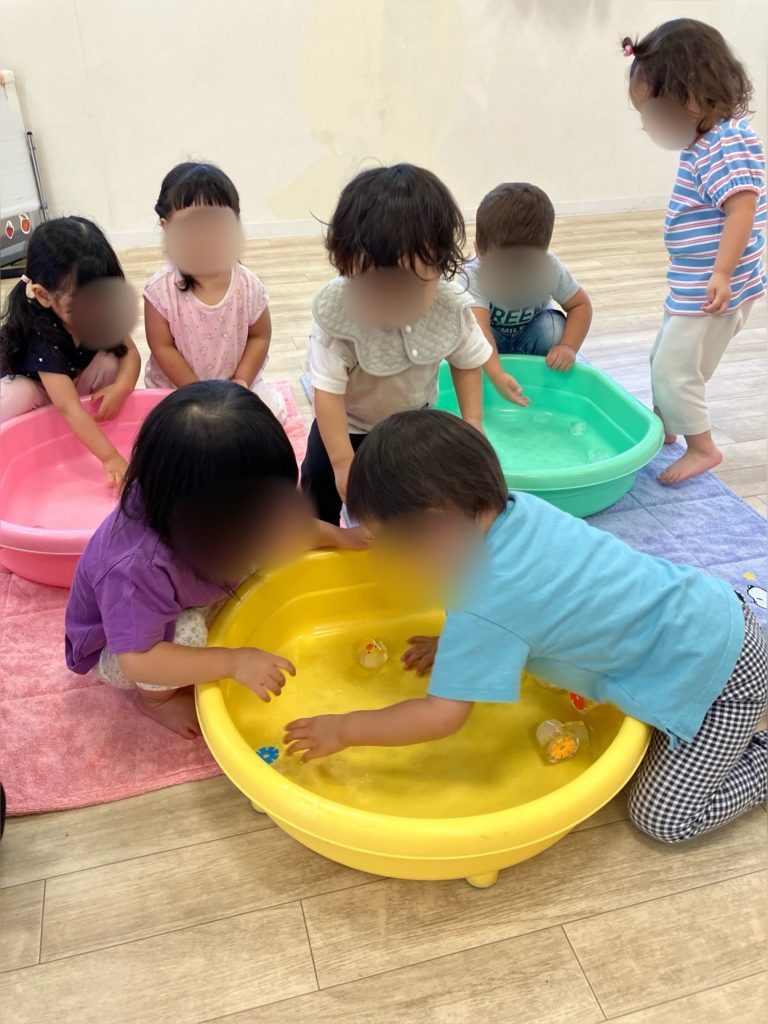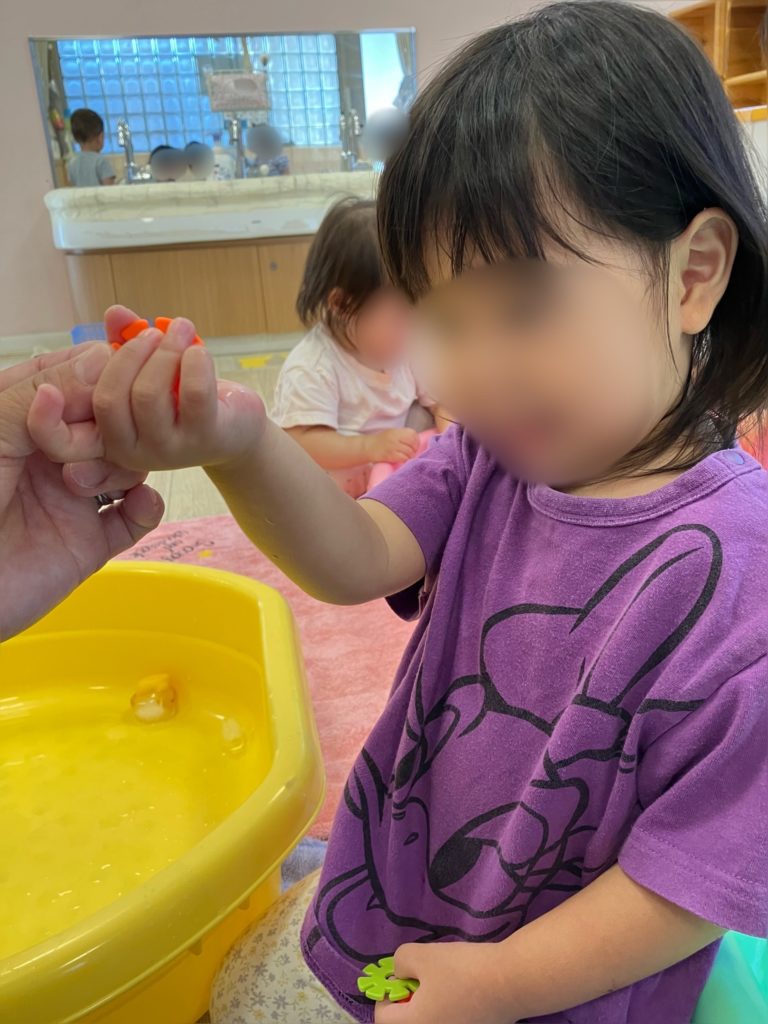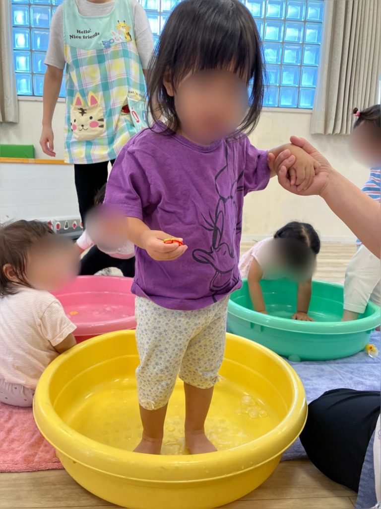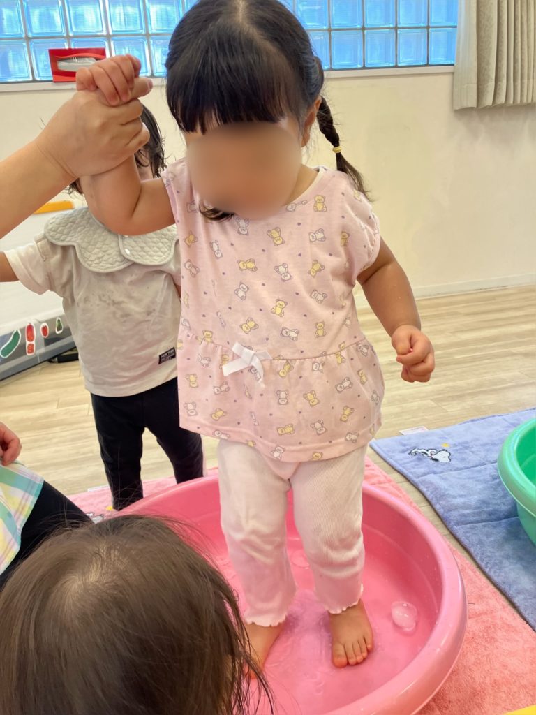 初めは手でバシャバシャと水の不思議な感触を楽しんでいました♪