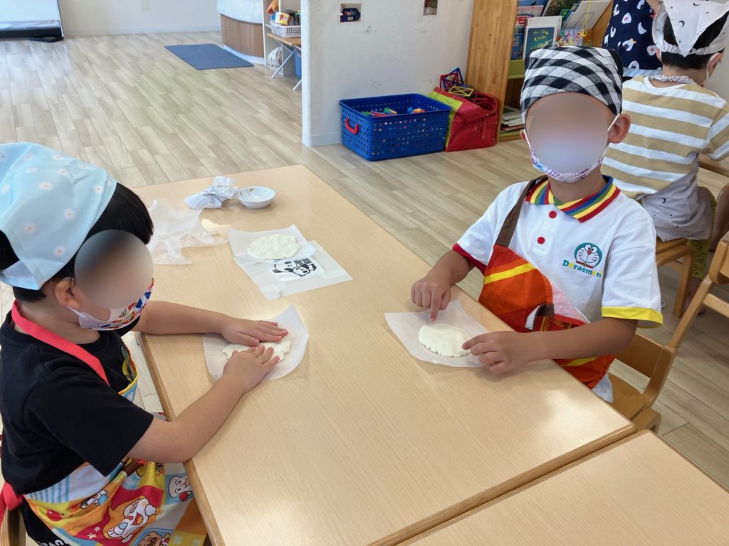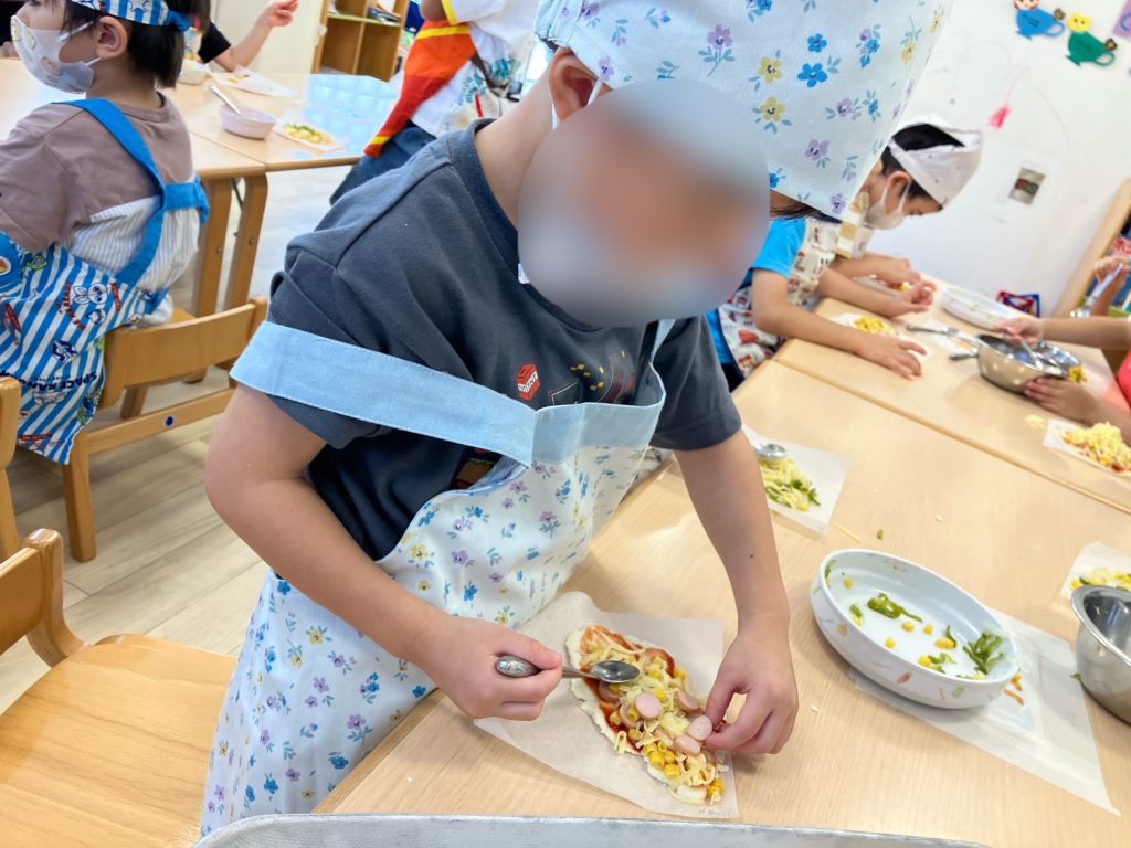 8月の様子 幼児☆ピザ作り 投稿日: 2025年8月28日 投稿者: info クッキングの時間に米粉のピザを作りました。 初めに、粉類と豆腐をポリ袋に入れ、友だちと協力してこねて生地を作り 1人1人、自分のピザの生地を薄く薄く伸ばして ケチャップを塗った上から 好きなようにトッピングしました。 。 コーン、ウインナー、ピーマン、玉ねぎ、チーズを 「ウインナーすきだからもっと乗せよう」 「コーンたっぷりししよう」 と好きなようにのせていきました。 給食で、ピザが焼き上がってくると 「これ○○ちゃんのピザだ」 「ピザおいしい」 とみんな嬉しそうに食べていましたよ!