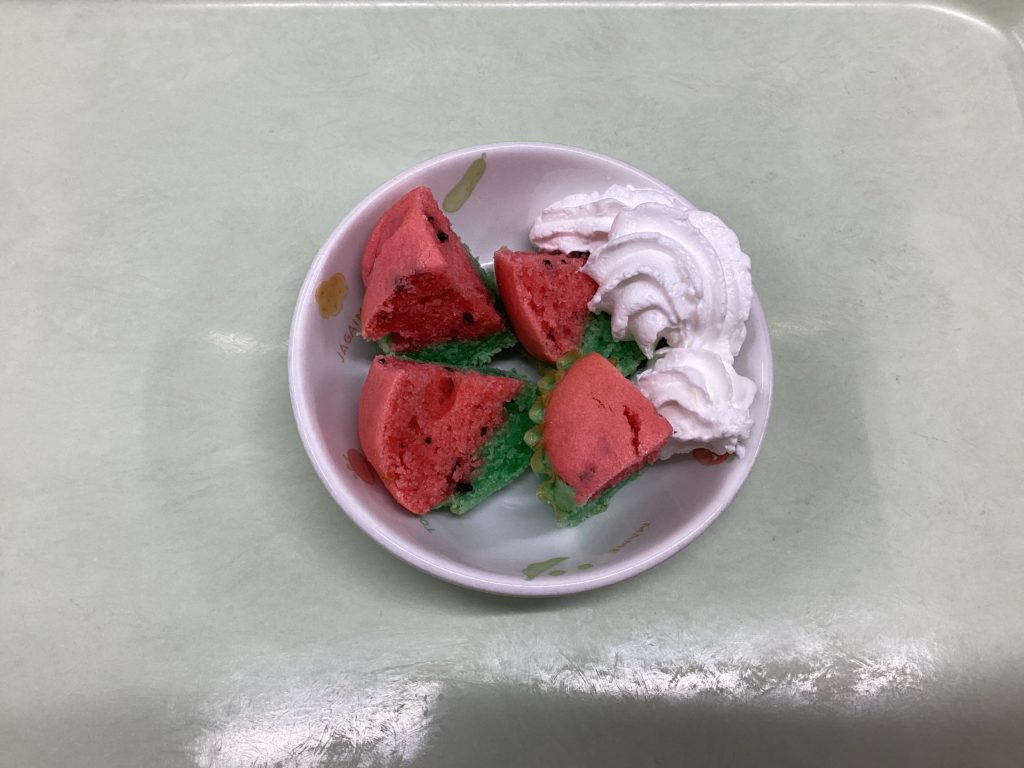 8月のバースデーケーキはスイカのかたちのケーキ。何度も試作を重ねかわいくできあがりました♩