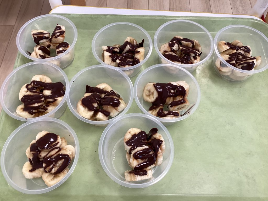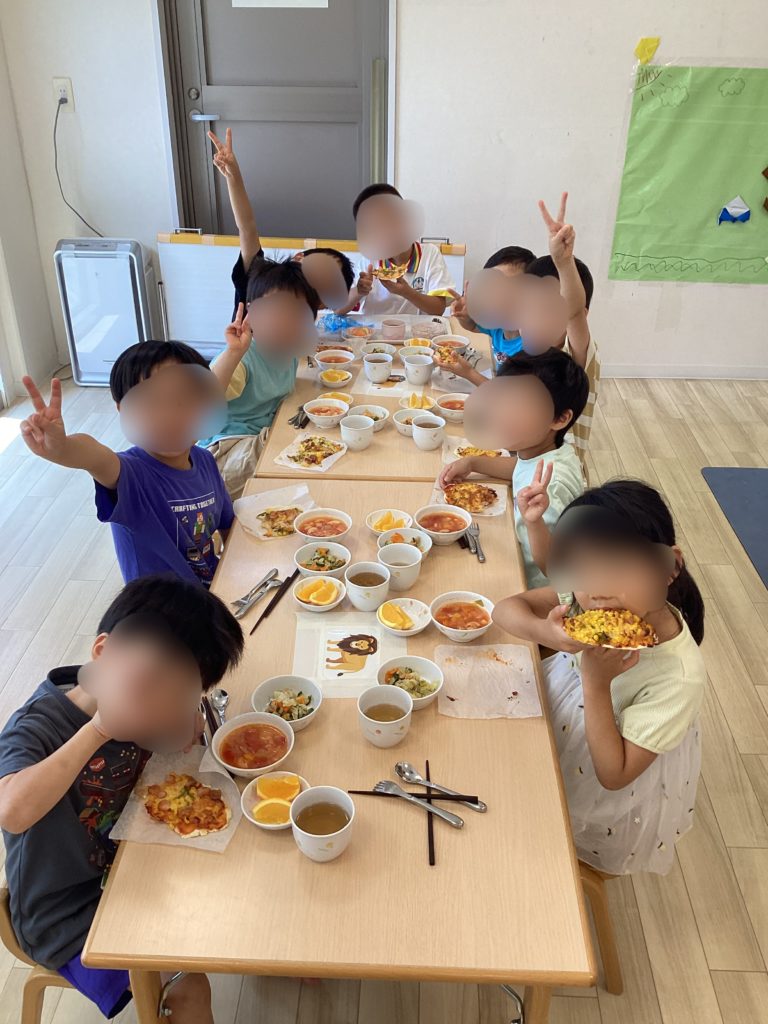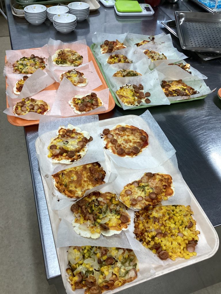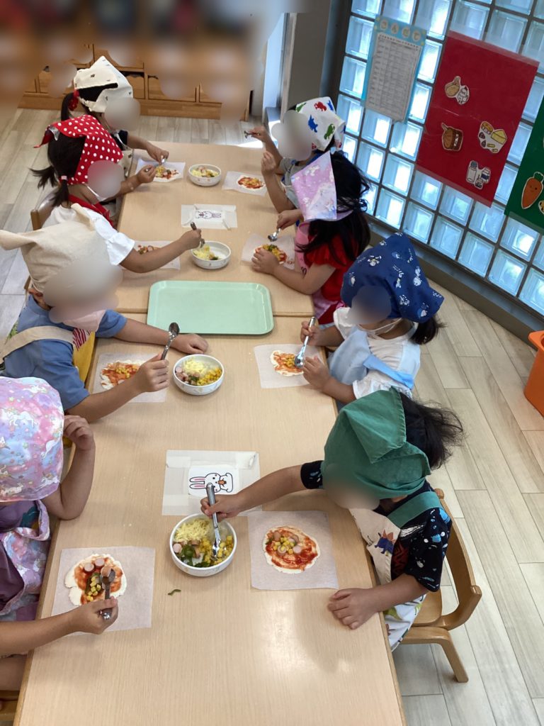 子どもたちが自分で生地を作り、生地を具材にのせて、オリジナルのピザを作りました。彩りもきれいで、「おいしい!」と笑顔が溢れていました。その日は世界の料理イタリアでしたので、おやつにジェラート風ヨーグルトを食べながら、イタリアクイズをして、楽しみました。